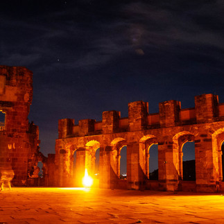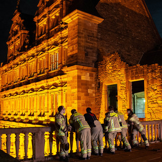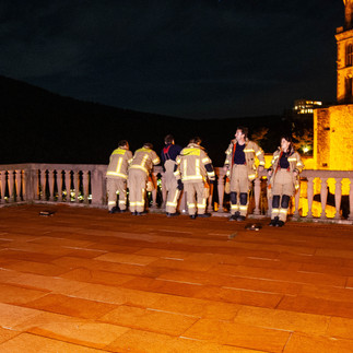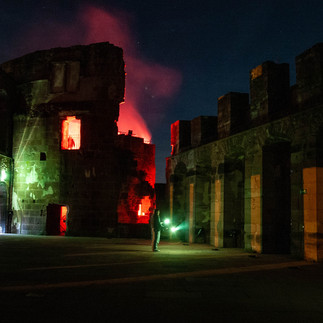 Pünktlich um 22:15 Uhr begann die Inszenierung mit bengalischen Lichtern, die das Schloss in ein geheimnisvolles rotes Licht tauchten – eine symbolische Erinnerung an die Zerstörung der Schlossanlage in den Jahren 1689 und 1693 durch französische Truppen